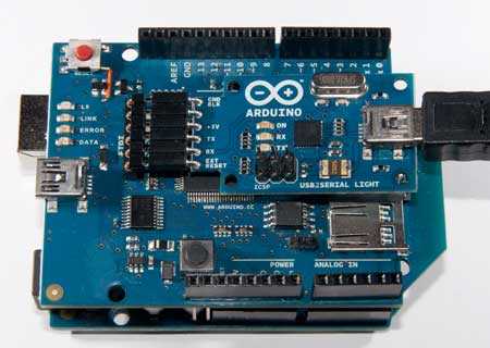 There is an onboard Mini-USB connector. This is not for programming an attached Arduino, it is for updating the AT32UC3 using the Atmel DFU protocol. The programming jumper adjacent to the power bus and analog inputs should be left unconnected for typical use. It is only used for DFU programming mode.